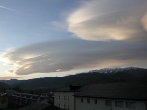 A 3/4 de 7, el cel de llevant vist des de casa tenia aquest aspecte. Les ventades del cap de setmana deuen continuar per allà dalt. El resultat: núvols llimats que s’amunteguen i que la llum del sol fa canviar de color.