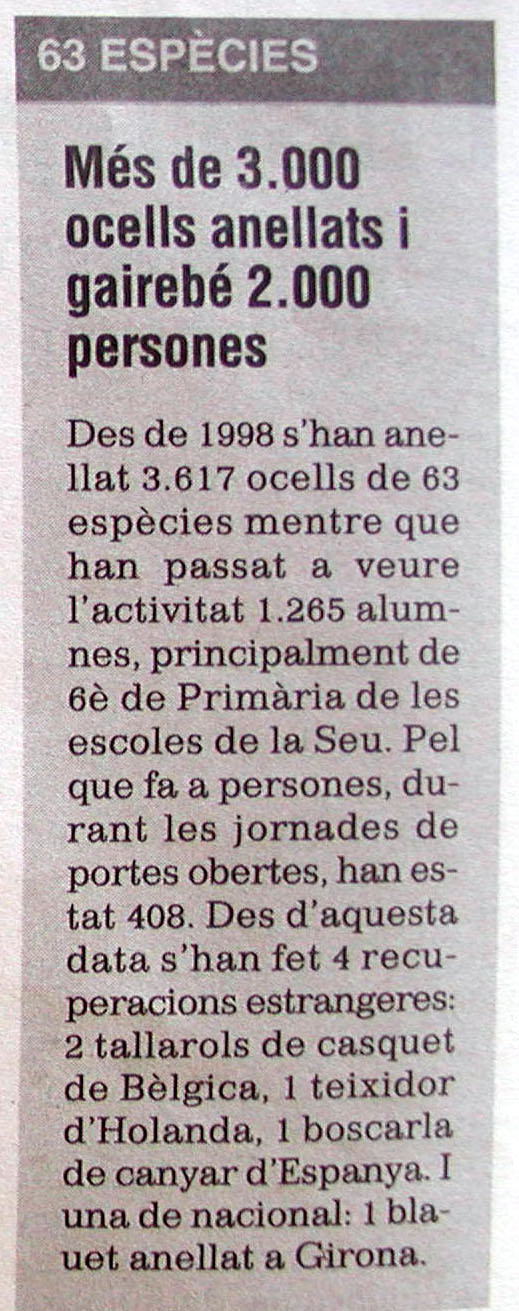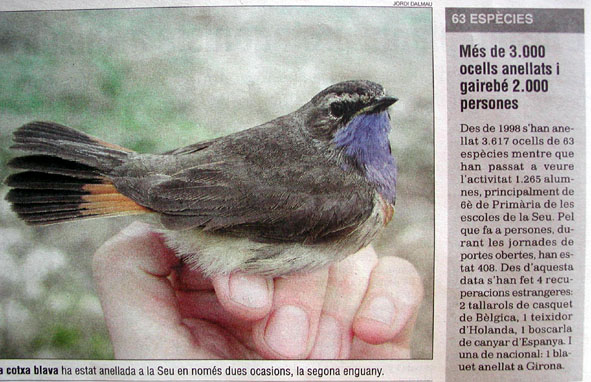 Amb aquest títol suggerent, el Pep Graell, encapçala avui un petit reportatge al suplement Pirineus del diari Segre sobre les campanyes d’anellament d’ocells que fem a la Seu, l’Ajuntament municipal i un servidor. Des del 1998 Déu n’hi do els ocells anellats (més de 3.000) i la gent que ha vingut a veure-ho (prop de 2.000 comptant els alumnes de les escoles de la Seu). A més, ja s’han fet 4 recuperacions estrangeres, com es pot llegir al requadre del costat.