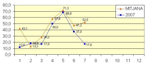 Avui comencem l’agost, i ho fem deixant enrera un juliol ben sec. El dèficit hídric que arrosseguem sembla que no tingui aturador, i després d’un primer semestre lleugerament per sota de la mitjana(tret del febrer, que fou una miqueta més generós), ara, amb només 17 litrets, la separació entre el que ha caigut i el que hauria d’haver caigut (52,5) s’accentua. Curiosament, estem igual que l’any passat: portem 219 litres des de l’1 de gener, i l’u d’agost de 2006 en dúiem 218,5. El 2005 encara fou pitjor, amb només 165,5. Ens n’hem d’anar al 2002 per trobar una mica d’aigua entre l’u de gener i el 31 de juliol, concretament 443 litres per metre quadrat. Fa tota la pinta que enguany serà el quart any seguit de secada a la Seu. Calor, n’ha fet, sobretot cap a final de mes, però cap cosa de no dir. El país té set, el país se’ns asseca.
