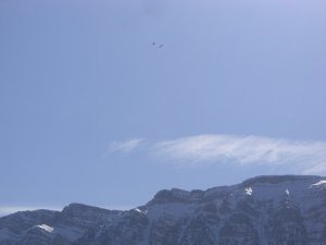 17-04-12, 2 gralles (Corvus monedula) volant sobre el col·legi Pau Claris i una altra reclamant des del seminari de la Seu d’Urgell.