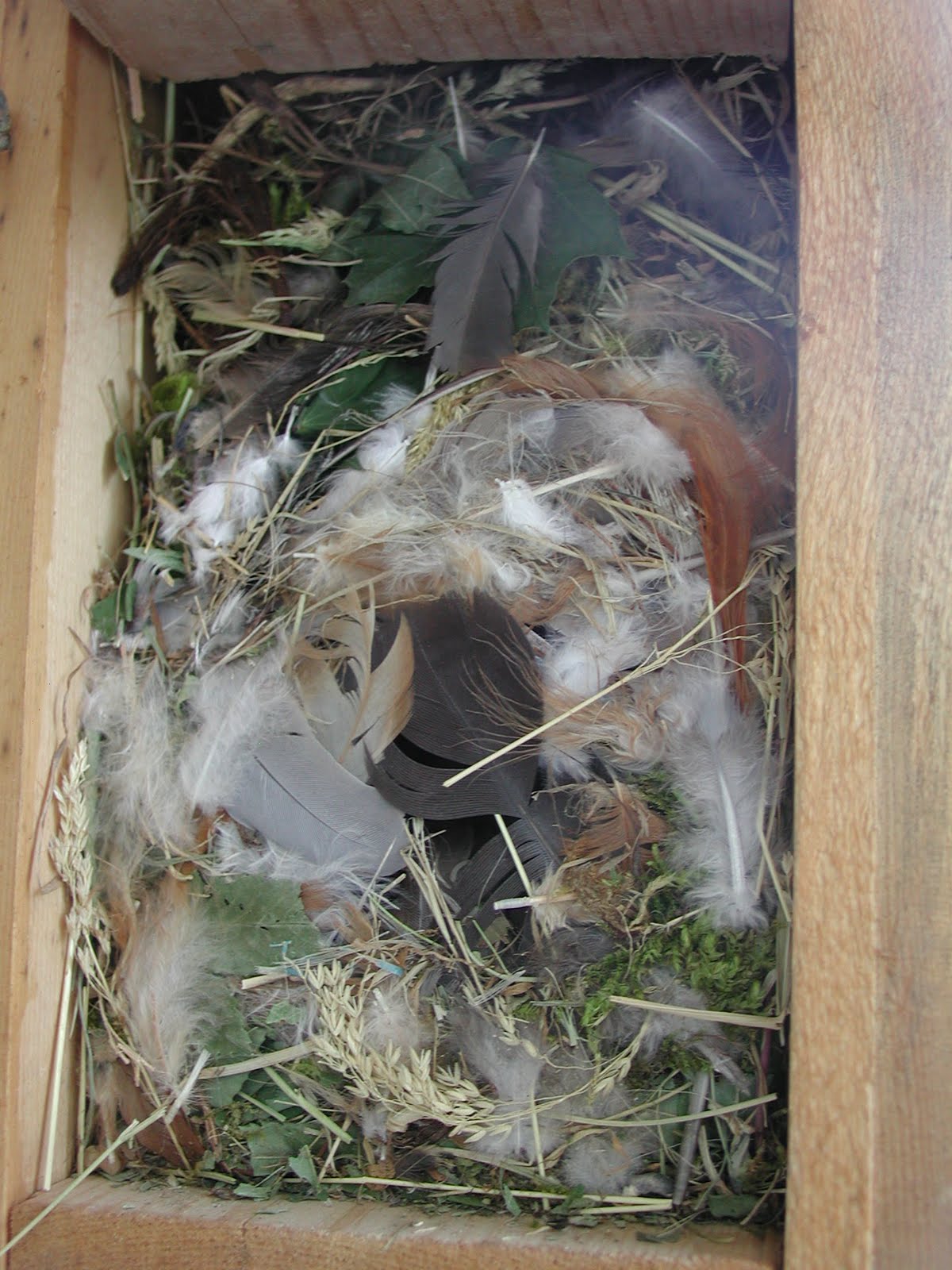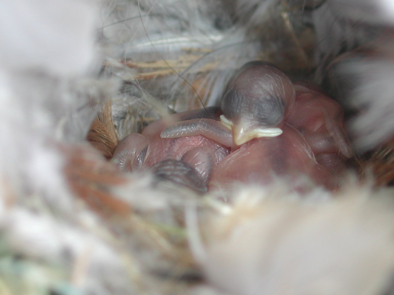 Aquesta setmana han eclosionat els 3 ous de la caixa-niu del balcó. El niu és una munió de plomes ben posades per fer-lo el més amorós, però alhora aïllat, possible. Aquí teniu un primer pla d’un dels 3 pardalets xarrecs i de la part posterior del niu. La cassoleta amb els pollets és a la part de baix, a radere d’aquest envà de plomes i herba.