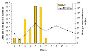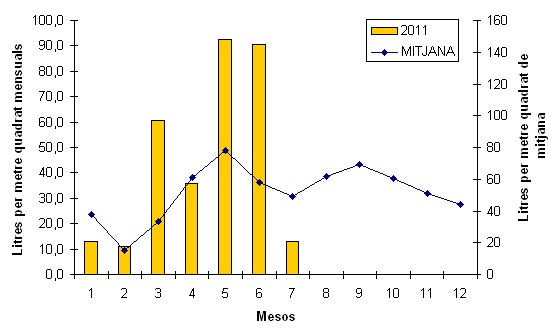 El juny ha seguit les passes del seu predecessor, el maig, i ens ha deixat una Seu ben regada, amb 90,5 litres per metre quadrat. Això suposa gairebé el doble de la mitjana 1996-2010. Mirant la gràfica del primer semestre d’enguany, entenem perquè tothom diu que aquest any plou molt. Vam tenir un gener i un abril més secs del que toca, però la resta de mesos hem estat per sobre de la mitjana, especialment aquests dos darrers. El juliol l’hem començat amb un nou alleugiment del termòmetre, i amb una bona tronada aquesta nit que ens ha deixat els primers 13 litrets del mes.