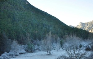 Les mínimes d’aquests dies són l’única distracció meteorològica que estem tenint aquest hivern, a la Seu. El fenomen de la inversió tèrmica es produeix amb molta intensitat, aquests dies de cel ras i pressions altes. Ahir, per exemple, mentre a la Seu teníem una mínima de quasi -8ºC, a Albet, a la Vall de Castellbò, a gairebé 1.200 metres de cota, la tenien de 0ºC, segons el Jose Quesada. Vam anar a la vall de Lavansa i a mesura que pujàvem cap al coll de la Trava, la temperatura també ho feia. Al magnífic mirador d’aquest indret estàvem a 0ºC. De tornada vam passar per la Barceloneta i, tot i ser prop de la 1 del migdia, va ser com entrar en un congelador, ja que el termòmetre del cotxe marcà -4ºC de sobte. Aquell fons de vall obac és realment gèlid. Avui encara ha pitjat una mica més avall i hem fregat els -9 (al riu devem haver tocat els -10!). Les fotos són del viatge d’ahir: Cadí pelat, Barceloneta gebrada i… regal faunístic d’última hora!