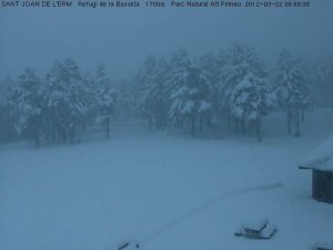Ahir van caure 25 litres a la  Seu: 3 a la matinada i 22 durant la resta de dia, i fins a la nit. Cap a les 11 de la nit hi va tornar. Va ser un pluja de les que agraden, amb bon ritme però sense estridències. Avui m’he desvetllat molt d’hora, a les 4 de la matinada, i sentia ploure amb ganes a l’ull de bou del cap de casa. A quarts de cinc estàvem a 4,6ºC. Mirant les gotes com queien sobre el vidre del llosat, m’he adonat que alguuuuuna era una miqueeeeta sòlida. És allò que n’he convingut dir aiguaneu de vidre. No n’he fet gaire cas.  Cap a quarts de sis havíem baixat a 3,6º i he pensat ai ai ai- Es veia alguna gota una mica més grassa, però d’aigua aigua. Però cap a 1/4 de 7… en qüestió de dos o tres minuts s’ha deixat de sentir el xap-xap sobre l’ull de bou i… nevava! Estàvem a 2,8º i baixant. D’aleshores ençà que va fent ruixats de neu molla i aigua, amb moments d’aiguaneu. Suara la temperatura és d’1,6ºC i neva amb intensitat. De moment no qualla, però tot just a la costa del pla de les Forques sí que ho fa. En 48 hores hem passat d’una secada rècord a una nevada tardana i no anunciada, ja que ahir a la nit preveien que aquesta matinada podria baixar fins als 1.200 metres de cota. A Sant Joan de l’Erm hi ha caigut la nevada de la temporada (a bona hora!!). Mireu la foto de la webcam de fa un quart d’hora. Ben bé un pam. Corregeixo dades de temperatura: 1,5ºC (cada dècima compta!)