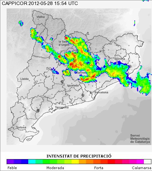 Ahir va caure una forta tronada a la Seu. Feia temps que no plovia tant i amb tantes ganes. El resultat van ser 34 litres acumulats en poc més d’una hora. Alguna estona va caure calamarsa barrejada amb la pluja. Com més a l’est de la Seu i la seva ribera, més fort va ploure. La raó és simple: la tempesta que ens va afectar ahir es va formar al nord-est de la Seu. Normalment, les tempestes viatgen d’oest a est. A la Seu les veiem venir del Pallars, i a Cerdanya les veuen venir de la Seu. Atès el seu origen geogràfic, les tempestes pallareses van descarregant la seva càrrega mentre avancen cap a nosaltres, i per això de mitjana a la Seu les tempestes deixen uns 10 litres d’aigua. Però he observat, i m’han explicat, que de vegades es formen tronades al nostre nord i nord-est, cap a sobre Calbinyà, Bescaran, la Rabassa, etc. Aquestes tronades poden tirar cap a l’est, tot seguint la seva circulació habitual, o bé baixar un pèl cap al sud o sud-oest. Quan passa això segon, l’aigua cau a somalades a la Seu. La distància entre el punt d’origen dels grans cumulonimbus i el de descàrrega és tan curta que plou a bots i barrals. I això és el que va passar ahir entre les 6 i les 7 de la tarda. La captura de pantalla del radar del Meteocat (cal afegir-hi 2 hores), assenyala ben bé l’origen geogràfic de la tempesta. Una estona abans d’aquesta imatge no hi havia cap traça de precipitació a prop nostre. Una estona després, la taca de pluja s’havia estès i ataronjat (va perdre rabietat, però sort, que si no hauria pedregat de debò).