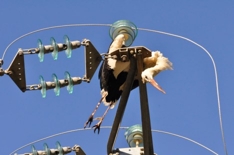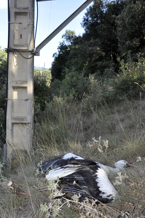 Doncs per si no n’hi havia prou amb la cigonya i el voltor del Balcó del Pirineu, abans d’ahir em truquen i em diuen que a tocar de Bellestar hi ha dues cigonyes més mortes per electrocució. Aquest n’era l’aspecte. En poc més d’un mes ja n’han mort 4 a la comarca, que jo sàpiga. Les empreses subministradores d’energia elèctrica tenen la solució a la mà: correcció de línies i suports. Els mètodes estan més que estudiats i hi ha manta bibliografia sobre el tema. Els beneficis milionaris que tenen han de servir, entre altres coses, per fer que la seva activitat, imprescindible per a tothom, no sigui la causa d’aquests i altres impactes ambientals. Estan causant la mort directa d’espècies protegides, algunes en perill d’extinció, causen talls i avaries als seus clients, i poden causar danys molt importants en forma d’incendis forestals i descàrregues. Correcció de línies i suports ja!!