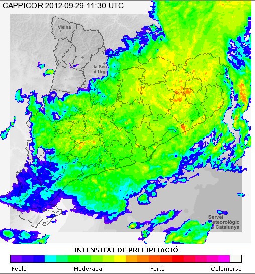 Ahir va ser un dia de tardor plujosa arreu del país com feia temps que no en teníem. A la Seu van caure 15 litres clavats i molt ben caiguts, és a dir que el model italià que deia que en caurien entre 15 i 20 va encertar-la de ple (llàstima que per la banda baixa). La precipitació a l’interior, est i sud de Catalunya va ser molt més intensa i quantiosa, amb registres al Vallès al voltant dels 100 litres! Al sud de l’Alt Urgell va ploure-hi molt més que aquí, amb 60 litres a Oliana, segons el diari ARA. La situació va venir de l’Est i el Sud-est, i per això va ser interessant veure com avançava i afectava distintament les comarques pirinenques. Així, mentre a la Cerdanya van caure entre 30 i 40 litres (estació de Queixans), al Pallars Sobirà els registres eren molt inferiors. Segons http://meteopallars.blogspot.com.es/, “Les quantitats recollides han estat entre els 12mm a Port Ainé, als 2,6mm a Espot, 7mm a Amitges, 3mm a Farrera, 4,6mm a Llagunes, 1,6mm a Planes de Son, 1,8mm a Esterri d’Àneu“. I nosaltres al mig, amb aquests 15 litres que situen el setembre un pèl per sobre de la mitjana mensual. Ah, i una altra enfarinada als cims. El Cadí avui torna a tenir una mica de neu a la part més alta per segon cop aquest mes. La imatge del radar mostra molt bé com a les 13:30 (hora oficial) l’extrem nord-occidental del país encara quedava al marge de la precipitació. I nosaltres al límit, just a punt de començar a ploure!