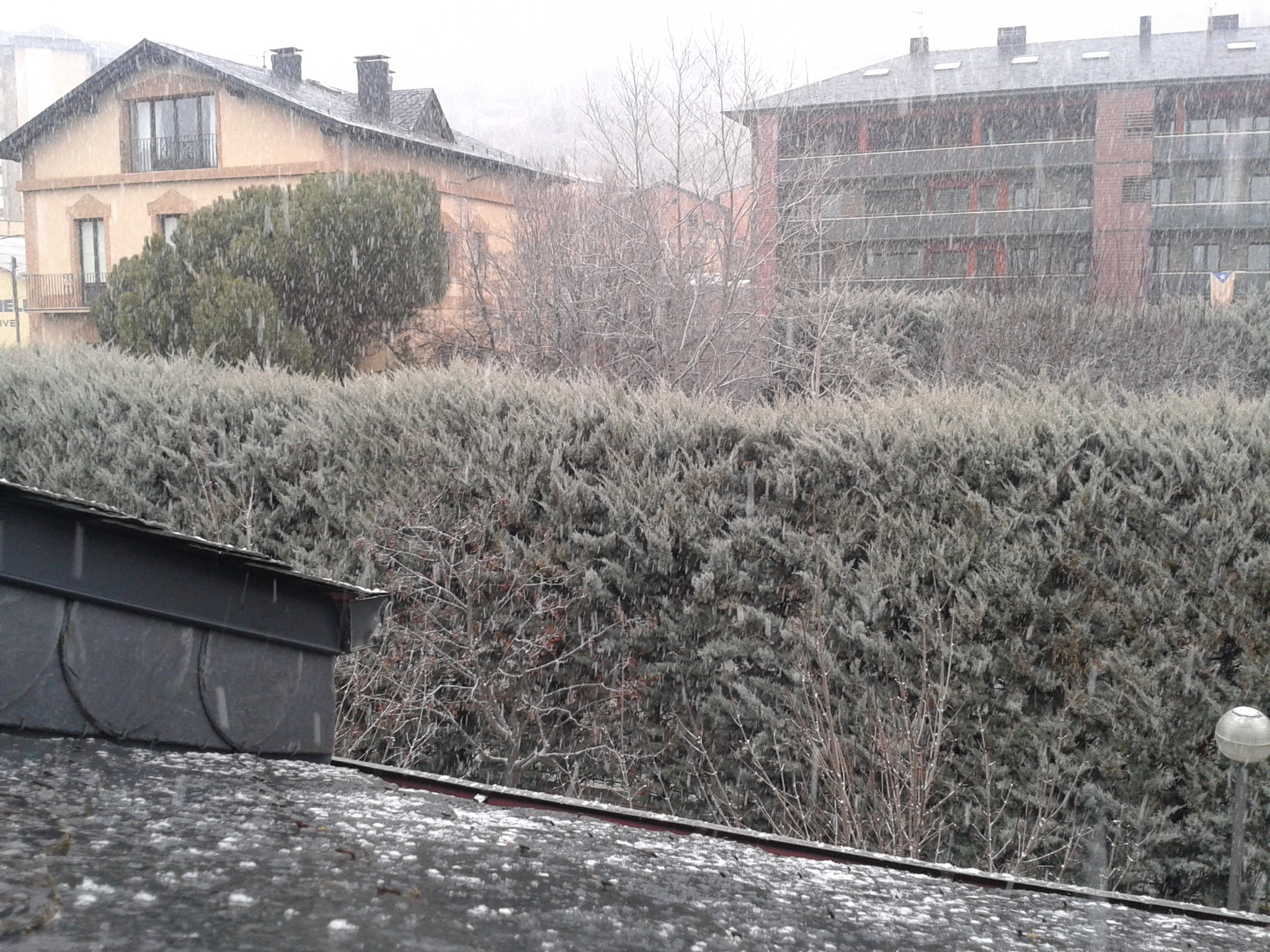 Ahir nova lliçó de meteorologia pirinenca: nit serena + mínima propera als -3ºC + entrada humida de sud amb precipitació= neu a cota 600-700, força més avall dels 1.200-1.300 previstos. I no fou una nevadeta d’enfarinar i prou, no. En va caure una miqueta més d’una mà, o sigui 9-10 cm. En alguns mitjans van dir-ne 15 i en d’altres 5 a la Seu. Jo en vaig mesurar 8 al pilar del jardí de casa, però ja s’havia pitxat una mica. La nevada forta va caure entre quarts de 12 del matí i quarts de 6 de la tarda. Hi va haver estones de nevàs molt intens, amb volves grosses i grasses. Si bé va començar amb neu seca (amb temperatura un pèl negativa), després es va humitejar. Quatre fotos de record. Malauradament, no en tinc de quan nevava més fort. Les 2 primeres són de quan s’hi posava bé, a quarts de 12. Les altres dues d’aquest matí des del Segre.