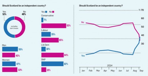 Ep, que això s’engresca! Per primera vegada el YES s’imposa al NO a Escòcia. I els falten 11 dies pel referèndum. Gràfic i imatges trets d’aquí.