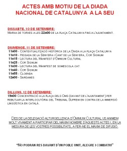 L’Astèrix ho diria així de clar: estan bojos, aquests espanyols! Però no és bogeria, el que tenen. És el cor agre, animadversió a la diferència, esperit conqueridor i poderío, mucho poderío. L’únic bo de tot plegat és que penso que a cada embranzida que ens foten, hi ha una tongada més de gent que s’adona que ja no hi ha peix, que el cove està foradat i que el millor que podem fer és mirar-nos-hi d’entendre com a veïns (que prou costarà). No sé si el preu que paguem per anar tenint més base social a favor de la independència és massa alt, però. La reforma constitucional recentralitzadora toca la pera. Al sr. Duran crec més per raons personals, d’ego, que de país.  Però això de la llengua a les escoles és molt fort. És molt propi de qui vol ser superior, de qui, havent passat el temps dels canons, vol imposar-se als tribunals, que és com dir jugar a casa. No m’estranya, per altra banda. Mai no m’he fiat d’aquest Estat. Algú que et vol pel que tens i que no pot suportar el que ets… val més tenir-lo ben lluny. Total, que tenim el president Pujol advertint de xocs ferroviaris i preparatius per a la batalla (s’entèn que dialèctica, institucional, ideològica, etc, però no física -Déu me’n guard!-), i mig país pendent d’una Diada que es preveu intensa. I a la Seu també. Aquí no hem tingut mai gaire tirada a les manifestacions col·lectives d’autoestima nacional. Ni la ciutadania ni les institucions. Enguany la cosa es presenta més bé. Tot i que no veurem onejar l’estelada al balcó de la casa de la vila, sí que podrem dur-la a la marxa de torxes de dissabte a la nit, o als actes commemoratius (ja era hora!) de diumenge. I per què no a la concentració de dilluns al vespre? Tots els detalls clicant la imatge.
