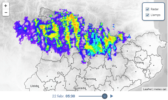 Abans d’ahir vam arribar als 18,7ºC de màxima a l’estació del jardí de casa. Ahir 10 ºC menys i a la tarda es va posar a nevar, i nevar fins ben entrada la matinada. Ha parat entre les 3 i les 6 i ha deixat 3 cm als llocs que més. El vent ara la remou i flamarades blanques de neu corren pels boscos del voltant de la Seu. Nevava amb ganes, amb volves mitjanes i si no hagués estat per la temperatura positiva de tota la precipitació, el gruix hauria estat sensiblement superior (a Puigcerdà 15 cm). Una nova nevada inesperada. Per bé que les previsions deien que podia baixar als 700, no s’esperava que la precipitació es reactivés tant i de manera tan generalitzada a tot el Pirineu. Encara s’han d’afinar molt, els models meteorològics.