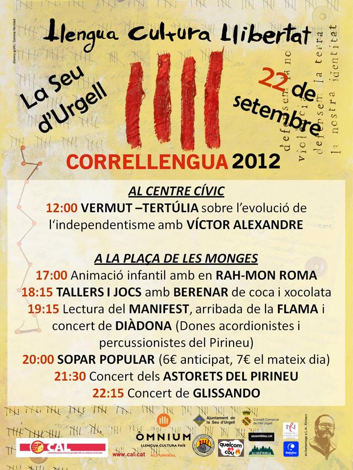 El proper dissabte, 22 de setembre, se celebrarà a la Seu el CORRELLENGUA 2012. Tot un seguit d’actes sobre la llengua i el país. Abans de dinar, un vermut-tertúlia amb el Víctor Alexandre, i a partir de les 5 de la tarda un reguitzell d’activitats per a tots els públics, inclosos els més petits. Aquí en teniu el cartell. Aquesta festa enguany també s’ha celebrat a Coll de Nargó.