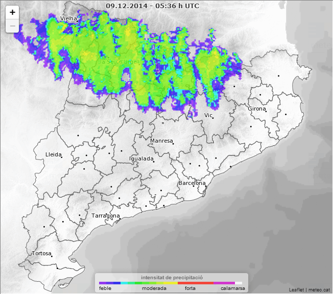 Una altra consideració de la nevada d’avui és l’abast geogràfic que està tenint. S’havia previst que quedés circumscrita al Pirineu i, potser arribar al Prepirineu, i així està essent. Ara al matí s’havia de quedar a la cara nord (geogràfica i meteorològica), i en canvi ha baixat bastant al sud (rodalies de Tremp, a Coll de Nargó, etc). Per si algú en tenia cap dubte (de vegades sento comentaris absurds com que l’Alt Urgell no és “prou” Pirineu!),  la meteorologia avui ens dóna una lliçó magnífica de geografia. El problema és que ens pensem que de Pirineu només n’hi ha un: el de caràcter alpí, amb molta neu i cims alterosos. En realitat, però, el Pirineu és divers. Nosaltres, a l’Alt Urgell, som el Pirineu sec i poc abrupte, per entendre’ns, però això de cap de les maneres ens resta pireneïtat. Mireu, sinó, què veia el radar de precipitació a primera hora del matí. Més clara… la neu!