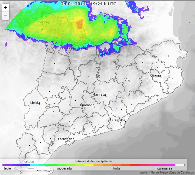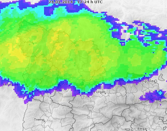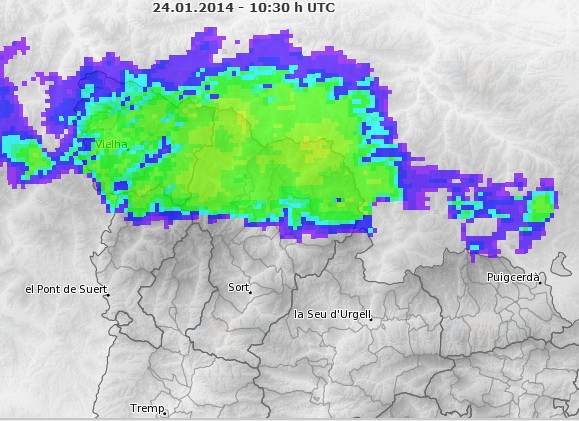 Ahir va estar plovent o nevant, segons la cota, a la meitat nord de l’Alt Pirineu i a tot l’Aran. Les imatges del radar ens van donar una bona lliçó de meteorologia pirinenca. La previsió no va encertar-la gaire pel que fa a l’abast de la precipitació, però essent una situació de nord, ja és molt que ens arribés una mica de pluja al vespre (4 mm). A la vall del Toran, Baish Aran, més de 80 litres fins al vespre, segons TV3!! Això, amb neu, a les cotes altes, és un tou espectacular. Les imatges del radar de sota mostren la insistència de la precipitació al nord de la nostra regió, i com va avançar cap al sud a la tarda. Ai l’orografia, si en determina de coses…!