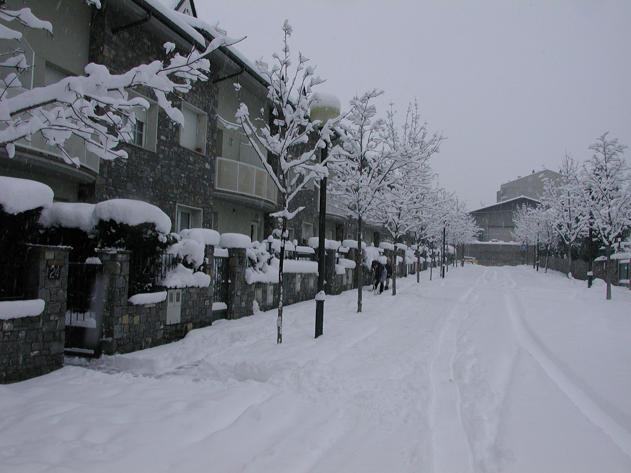Aquest cop el temps ens l’ha ben colat! Totes les previsions han fet figa. Que si seria una nevada extensa, que si arribaria fins més avall i tot del Prepirineu, que si tants centímetres,… Re de re. A la Seu quatre volvetes mínimes aquest matí i una pseudoenfarinada als prats de sobre Artedó. Com altres cops, ha quedat a la cara nord i prou. Màxim 3 cm a Puigcerdà, 4 a Isavarre, 7 a Vielha, 10-12 a Llívia, 15 a Sant Joan de l’Erm i uns 20 a Soldeu, entre altres. Al “poble” de Baquèira 50 i a Arcalís 85, però la notícia no era aquesta, sinó l’abast geogràfic extens de la precipitació. Seria interessant que els experts miressin d’entendre i d’explicar per què no ha arribat allà on preveien. Sempre ens queda prende’ns-ho amb humor, que avui és el dia dels Sants Innocents, i confiar que al gener faci alguna cosa com aquesta de la foto (26-28 de gener de 2006).