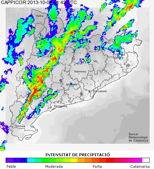 Ahir a la tarda hi havia activat, un altre cop, un avís de perill per intensitat de pluja, i a fe que es va complir. Evidentment, no va ploure igual a tota la comarca, ni a tot el Pirineu, ni a tot el país, però on va picar de valent van caure aiguats importants. És el cas, per exemple, de Fórnols de Cadí, on van caure 73 litres. A Tuixent, en canvi, tot i ser a la mateixa vall, en van recollir 14. A la Seu en vaig recollir 18. Les cortines de pluja més intensa ens van passar uns escassos km al sud, a l’altra banda del Segre. Les capçaleres de rierols com el de Cerc i el de la Color van rebre molts litres a partir de les 4 de la tarda. La seva crescuda no es va fer esperar i van sortir de mare en alguns indrets. Ja portem gairebé 120 litres a la Seu aquest mes de juliol, i això és bastant més del doble de la mitjana mensual. El total d’enguany (611,5 mm) ja supera la mitjana anyal del període 1996-2012 (608,4 mm).