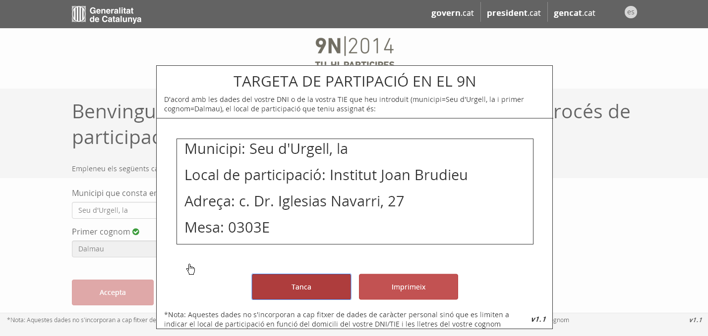 Hi ha gent tiquismiquis que diuen que si no reben la tarja censal no aniran a votar el dia 9 de novembre. Pusil·lanimitats i excuses de mal pagador a part, si això és el que els amoïna ja poden entrar aquí i veure on els tocarà votar, que juntament amb el nostre nom (que representa que ja el sabem) és del que ens informa la tan enyorada tarja censal. Jo ja la tinc: